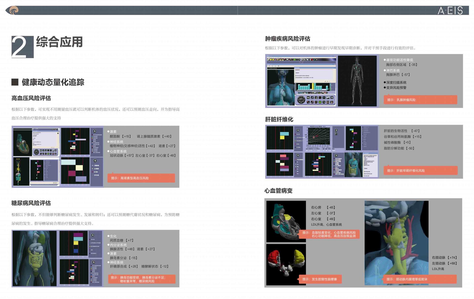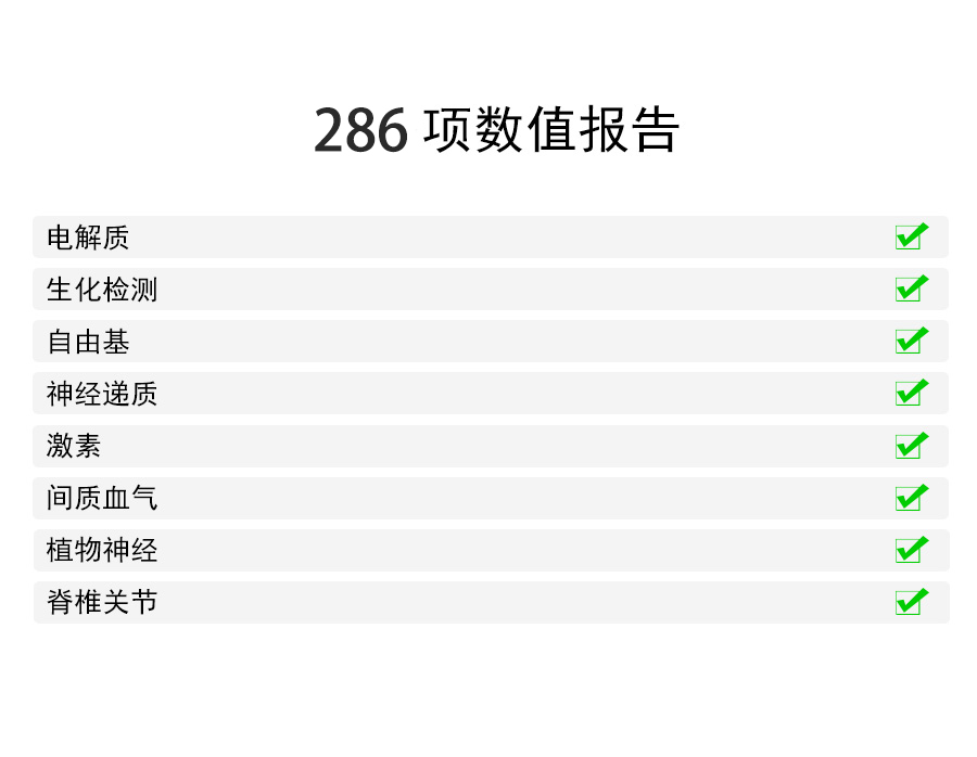 3分鐘即可檢測(cè)人體286項(xiàng)指標(biāo),實(shí)現(xiàn)對(duì)人體整體各組織、各器官功能的全面監(jiān)測(cè),并對(duì)亞健康及早期病變進(jìn)行準(zhǔn)確地評(píng)估,預(yù)測(cè)潛在的危險(xiǎn) 因素及疾病發(fā)展方向,對(duì)疾病風(fēng)險(xiǎn)作出早期預(yù)警。